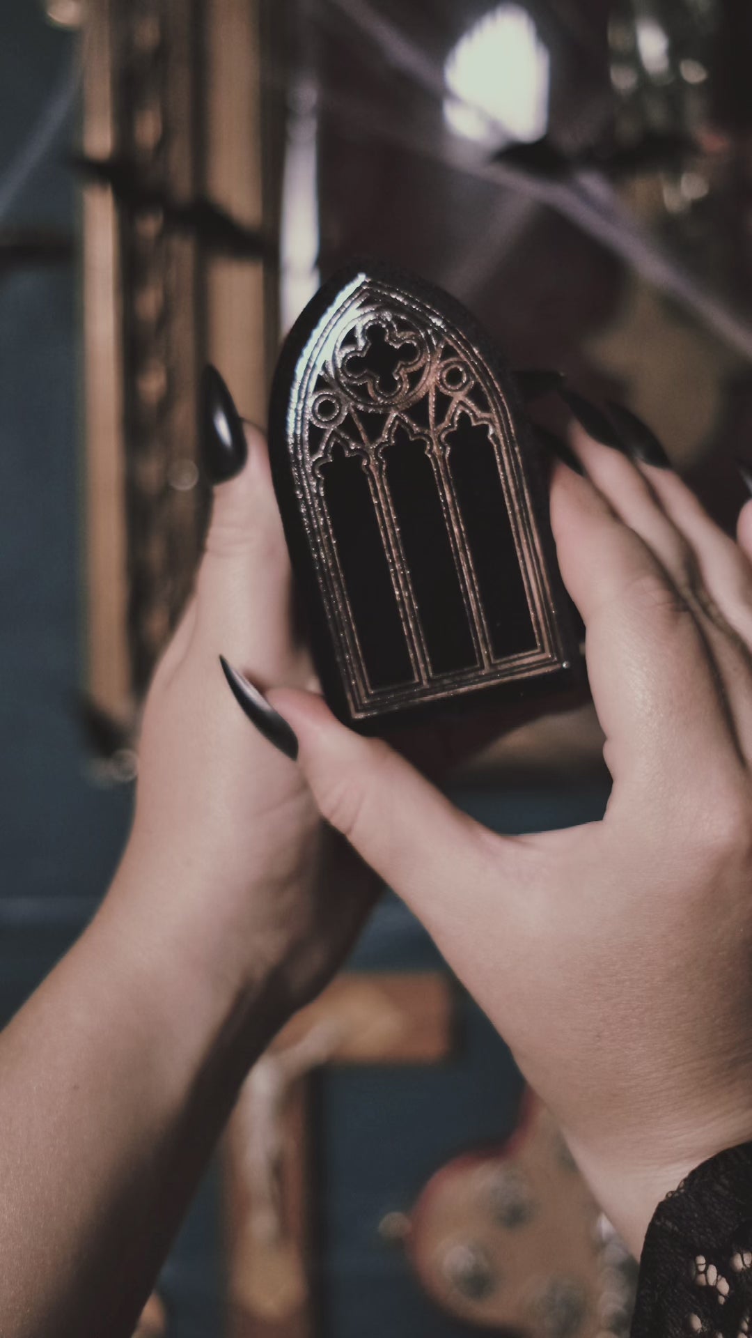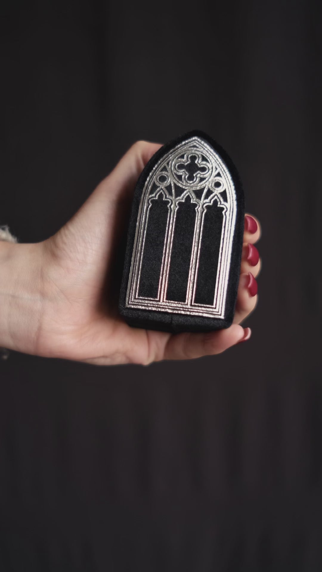 Step into a world cloaked in shadows and romance with our Covenant Gothic Window Wedding Ring Box, a relic that beckons to souls entwined in a love that defies the realms of the ordinary. This meticulously crafted ring box is more than a vessel for your most cherished tokens of affection; it is a statement of undying commitment and devotion, steeped in the dark and mystical.