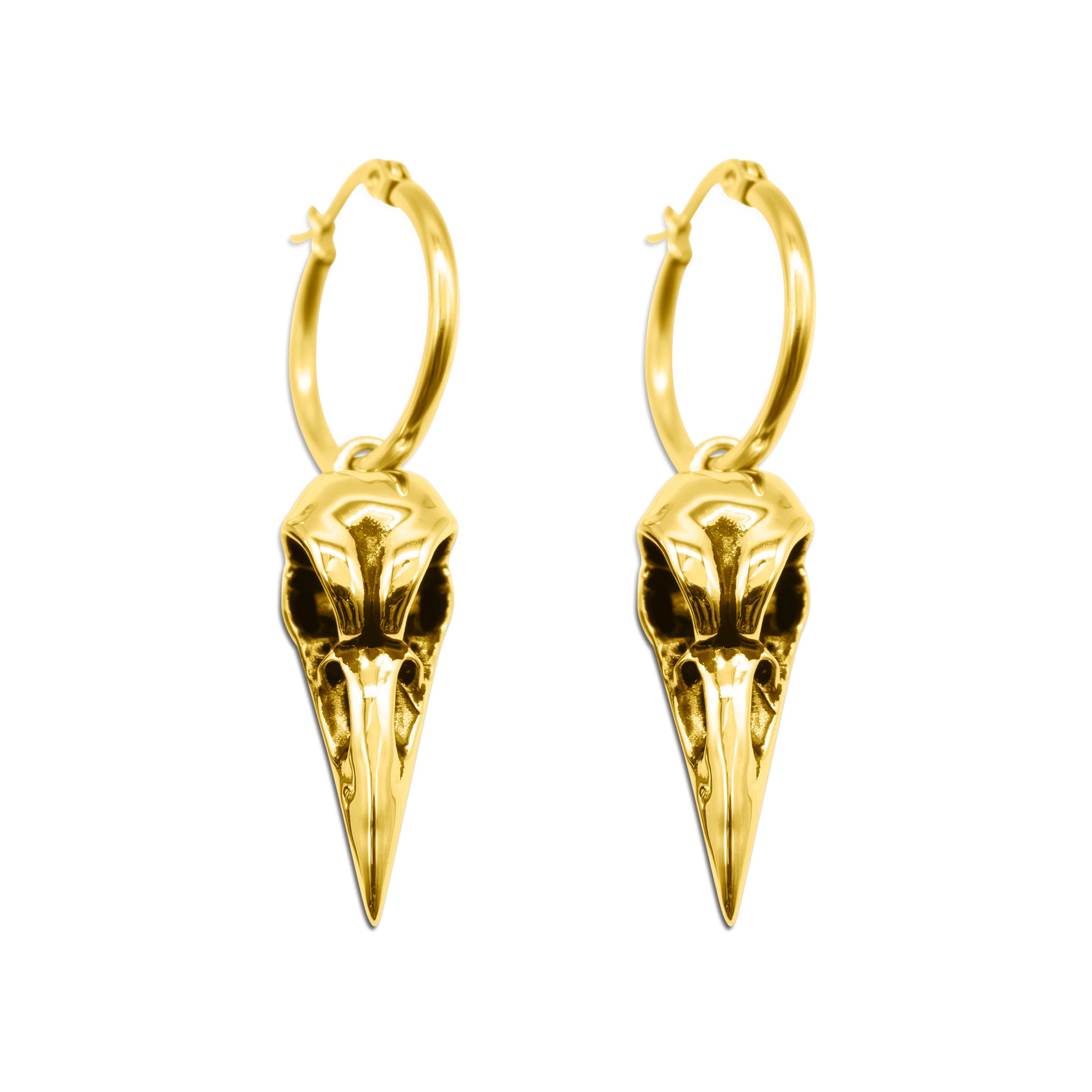Invoke the whispers of the void and the forgotten secrets of the dark with these Gold Raven Skull Earrings, a macabre tribute to death, mystery, and the supernatural. The raven—foreboding harbinger of omens, keeper of ancient secrets, and messenger between worlds—rests upon your ears in gleaming gold, a dark symbol of wisdom entwined with the shadows of the unknown.