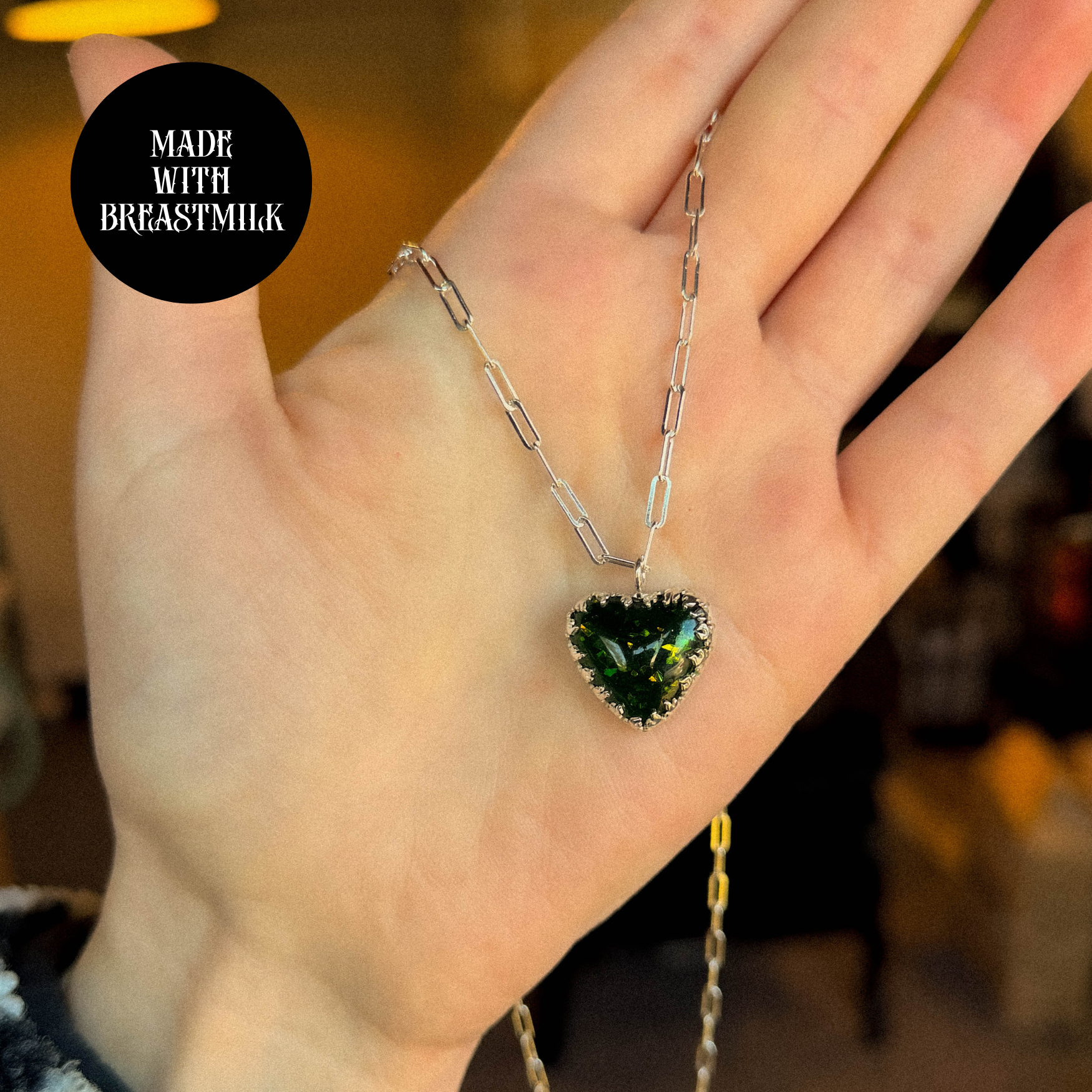 Celebrate the profound bond between mother and child with the Mother of Flames Gothic Heart Breastmilk Necklace. This unique pendant features a heart-shaped resin stone crafted from preserved breastmilk, symbolising nourishment and love. Encased within intricate flame details, it represents the fierce passion and warmth of motherhood.