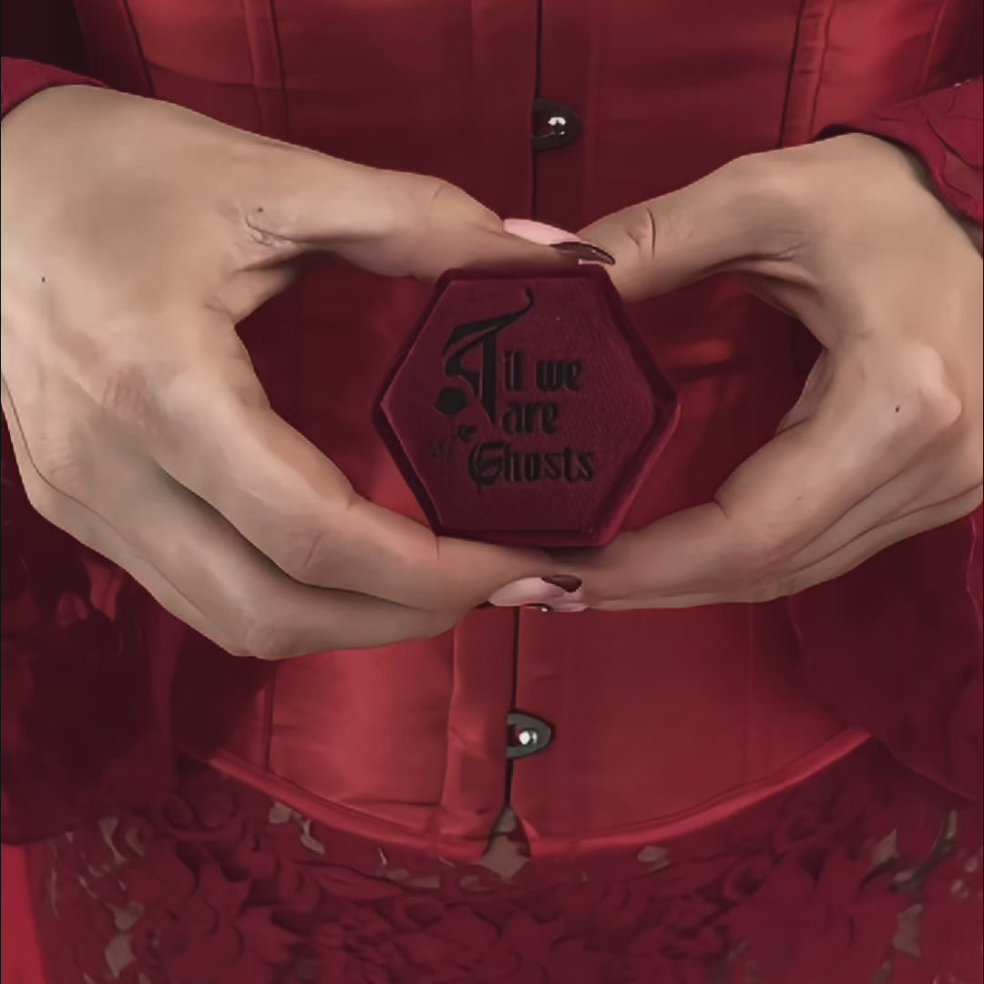 Bound by devotion and carved from shadows of longing, the 'Til We Are Ghosts' Ring Box is a vessel for love that lingers beyond life’s final breath. Cloaked in rich crimson velvet, its hexagonal form evokes the symmetry of fate and the inescapable pull of promises that tether souls across time.