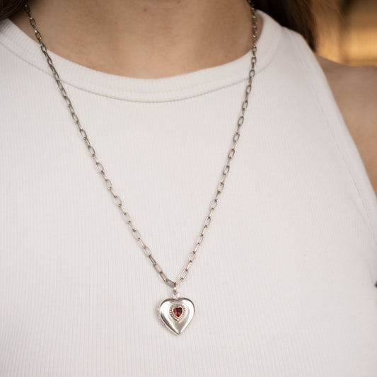 Sterling Silver Red Gem Heart Locket with Decorative Chain