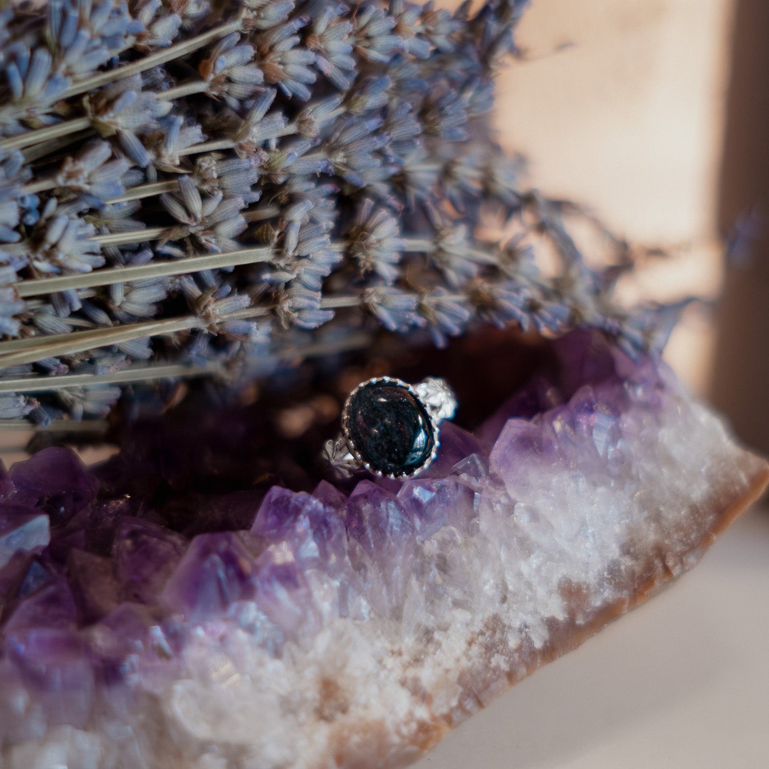 This Purple Labradorite Celestial Ring combines dark elegance with celestial mystery. Featuring a large oval labradorite stone that shimmers with deep purple hues, the ring is framed by bold stars on either side, enhancing its gothic allure.