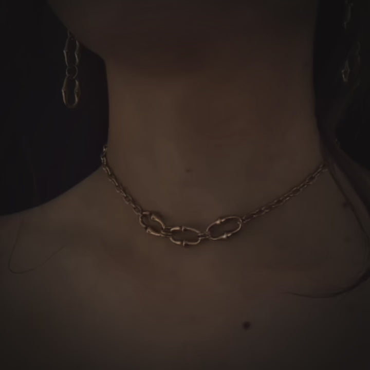 The Revenant Choker Necklace, crafted in gold, channels ancient power with its medieval-inspired chain link design. This piece exudes a dark, mystical aura, perfect for adding an enchanting, otherworldly edge to any ensemble.