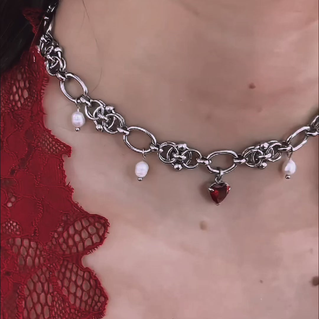 Scarlet Grace choker, a masterpiece that is strung with lustrous freshwater pearls that glisten like moonlit tears, this enchanting necklace culminates in a striking red heart stone—a vivid emblem of love, longing, and forbidden desires.