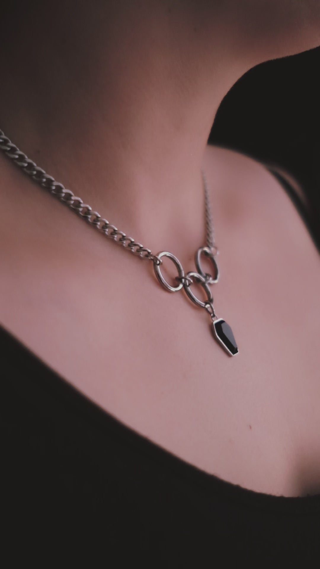 Dainty death on the go. Introducing the Crypt Black Coffin Choker, the perfect accessory for the bold and empowered. With stainless steel and black cubic zirconia, this choker is sure to add a flair of gothic and alternative style to any look. The Crypt summons you.