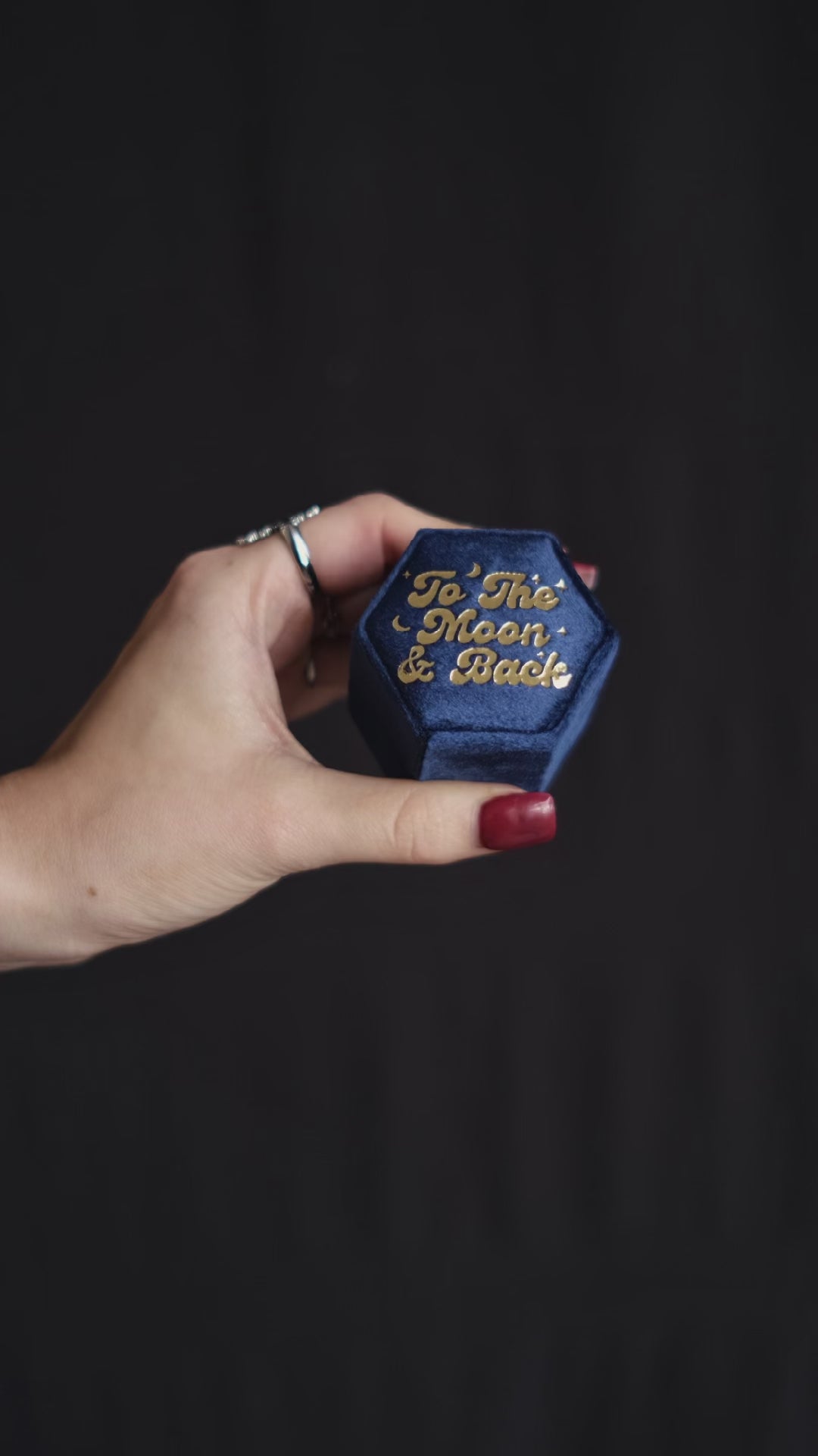 Keep your precious rings safe and add a quirky touch to your special day with this 'To The Moon and Back' Blue Wedding Ring Box! Crafted from luxurious blue velvet and featuring gold print, this ring box is sure to make your engagement truly enchanting.