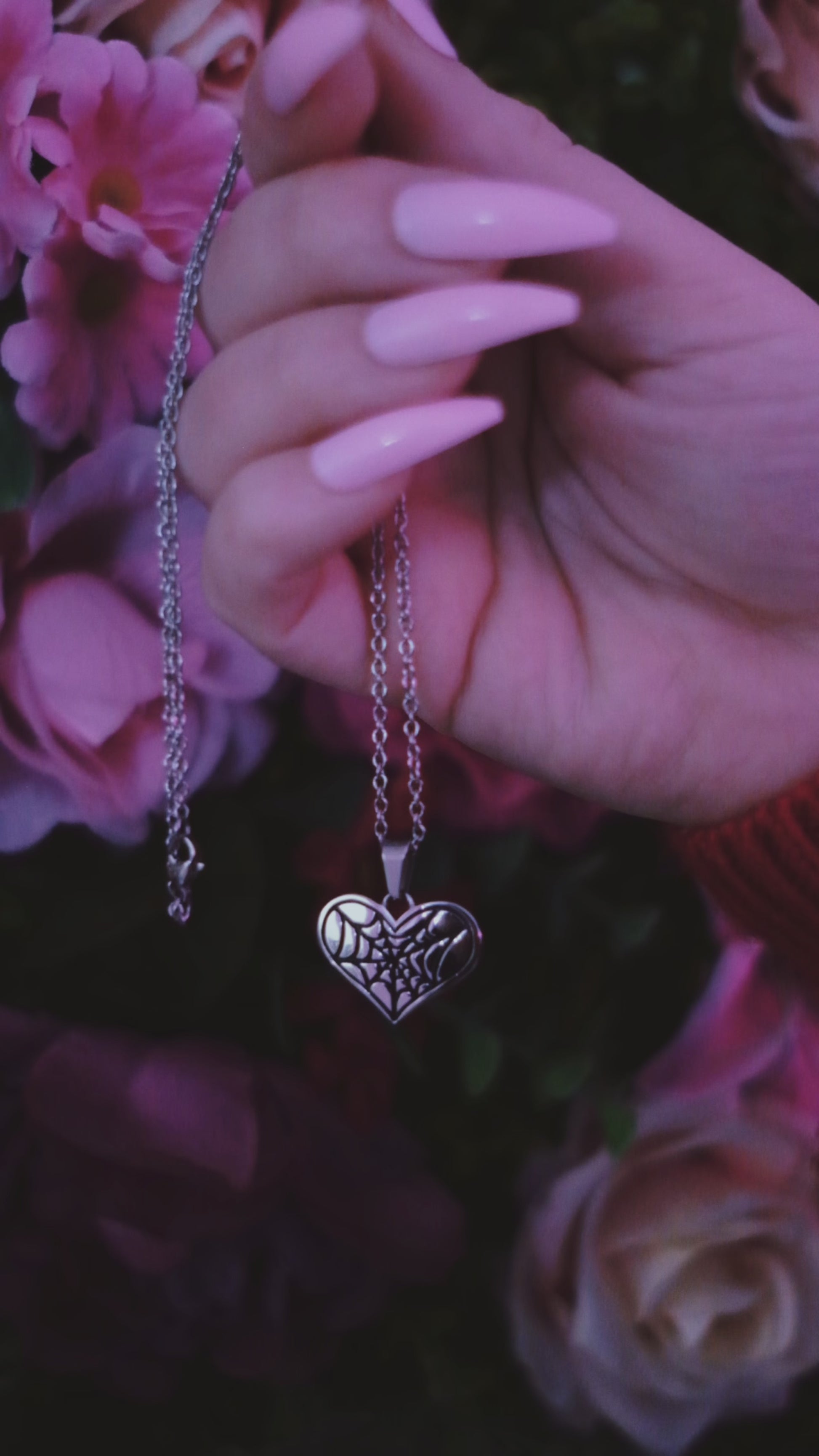 Elevate your outfit with Cobweb Heart Necklace – our exclusive stainless steel necklace designed with intricately crafted spiderweb detailing. This gothic-inspired necklace offers a subtle and refined way to add a spooky touch to your jewellery collection.
