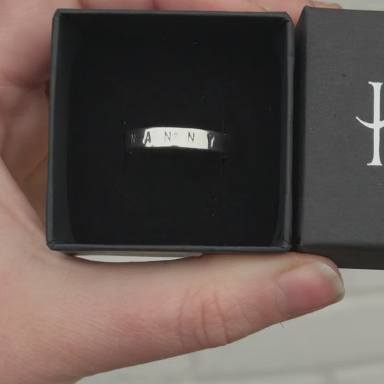 This hand-crafted ring bears your name stamped into Sterling Silver metal, a personal talisman for those who embrace the shadows. Each letter is pressed by hand, creating subtle variations that make your ring uniquely yours.