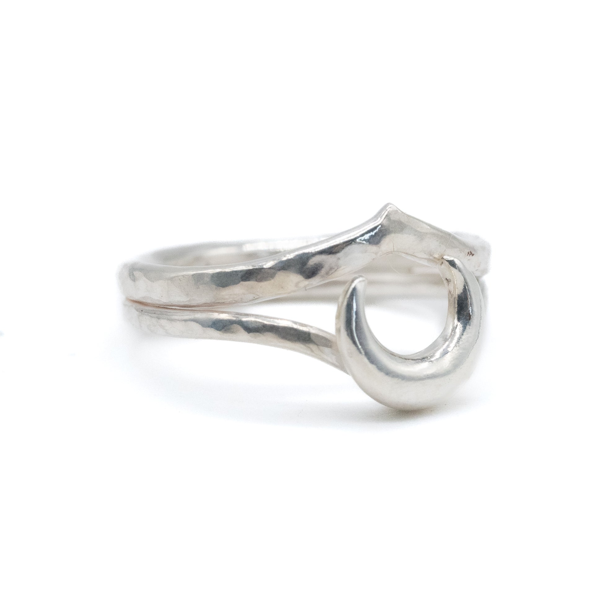 A unique handmade sterling silver ring featuring a delicate crescent moon on a sleek double band design. This one-of-a-kind piece is perfect for moon lovers and those drawn to celestial jewellery.