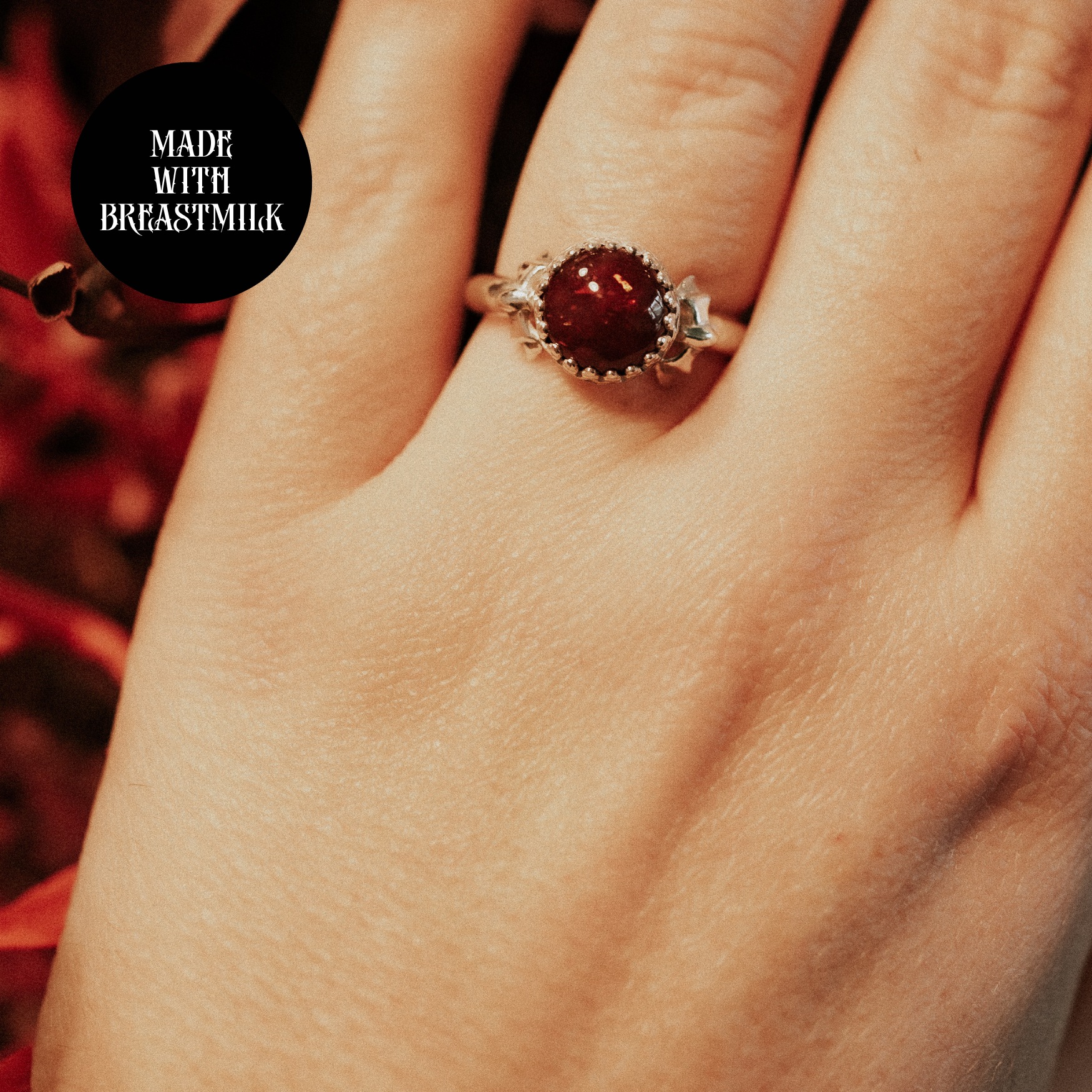 Embrace the mystery and strength of motherhood with the Night bound Bat Gothic Breastmilk Ring. This striking ring features a circular resin stone made from preserved breastmilk, symbolising the nurturing bond between mother and child. Flanked on either side by detailed bat motifs, it embodies protection, transformation, and the night's quiet power, reflecting a mother's unwavering care and resilience even in the darkest hours.