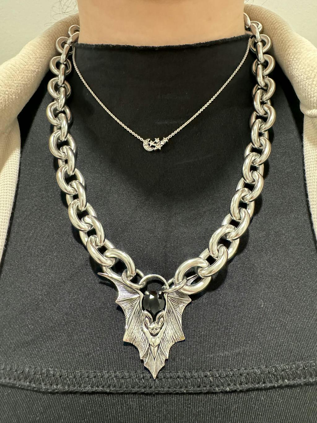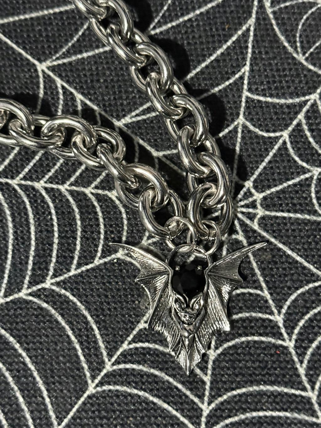 The Nightfall Obscura Bat Necklace is crafted in polished stainless steel. The sculpted bat pendant spreads its wings in dramatic gothic form, centred with a deep black stone that mirrors the darkness of the night sky.