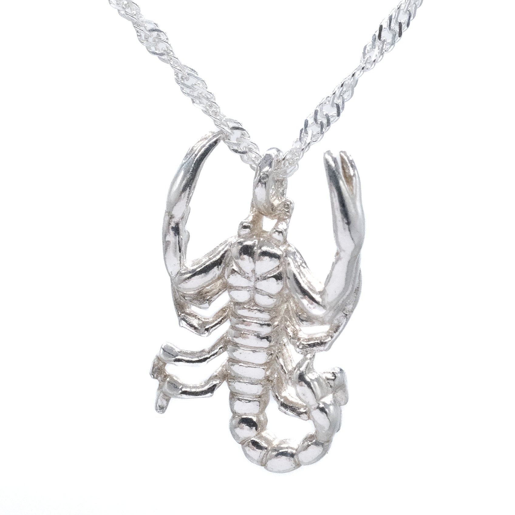 A bold sterling silver necklace featuring a detailed scorpion pendant hanging from a classic twisted rope chain. The pendant has great texture and presence — fierce, a little edgy, and perfect for anyone who loves symbolic or statement jewellery. The rope chain adds a nice bit of vintage charm and catches the light beautifully.