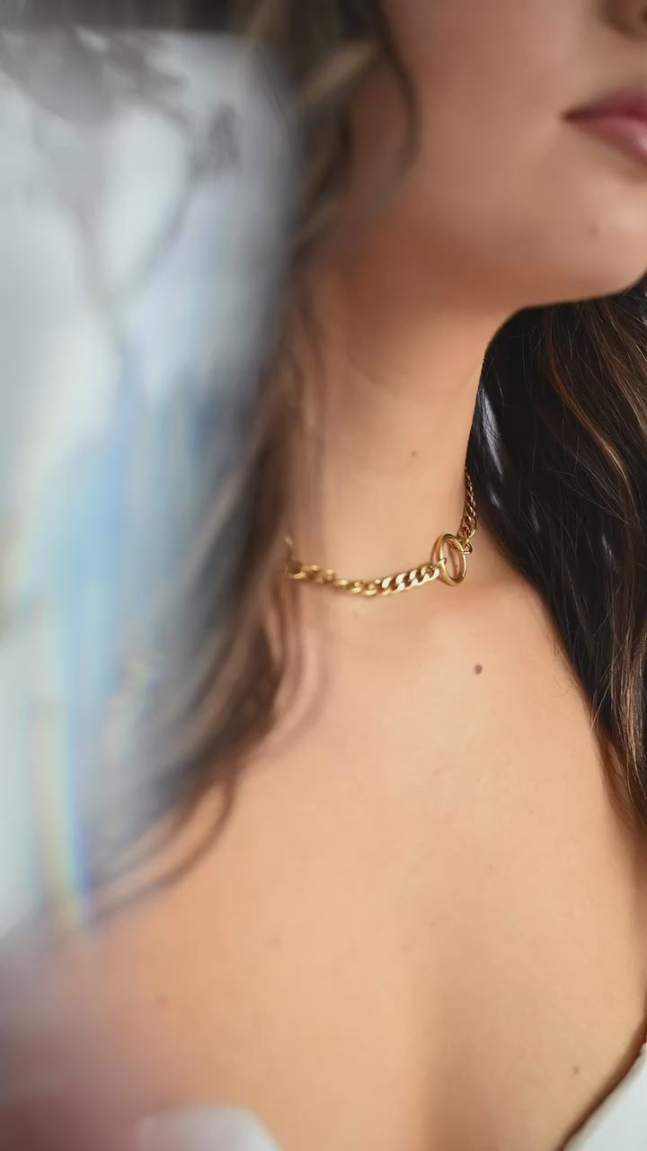 Elevate your style with our Aura O Ring Gold Curb Chain Choker Necklace. Made with a gothic-inspired o ring design and chunky gold plated chain, this necklace adds a touch of edgy elegance to any outfit. Crafted from durable stainless steel, it's both sleek and statement-making.