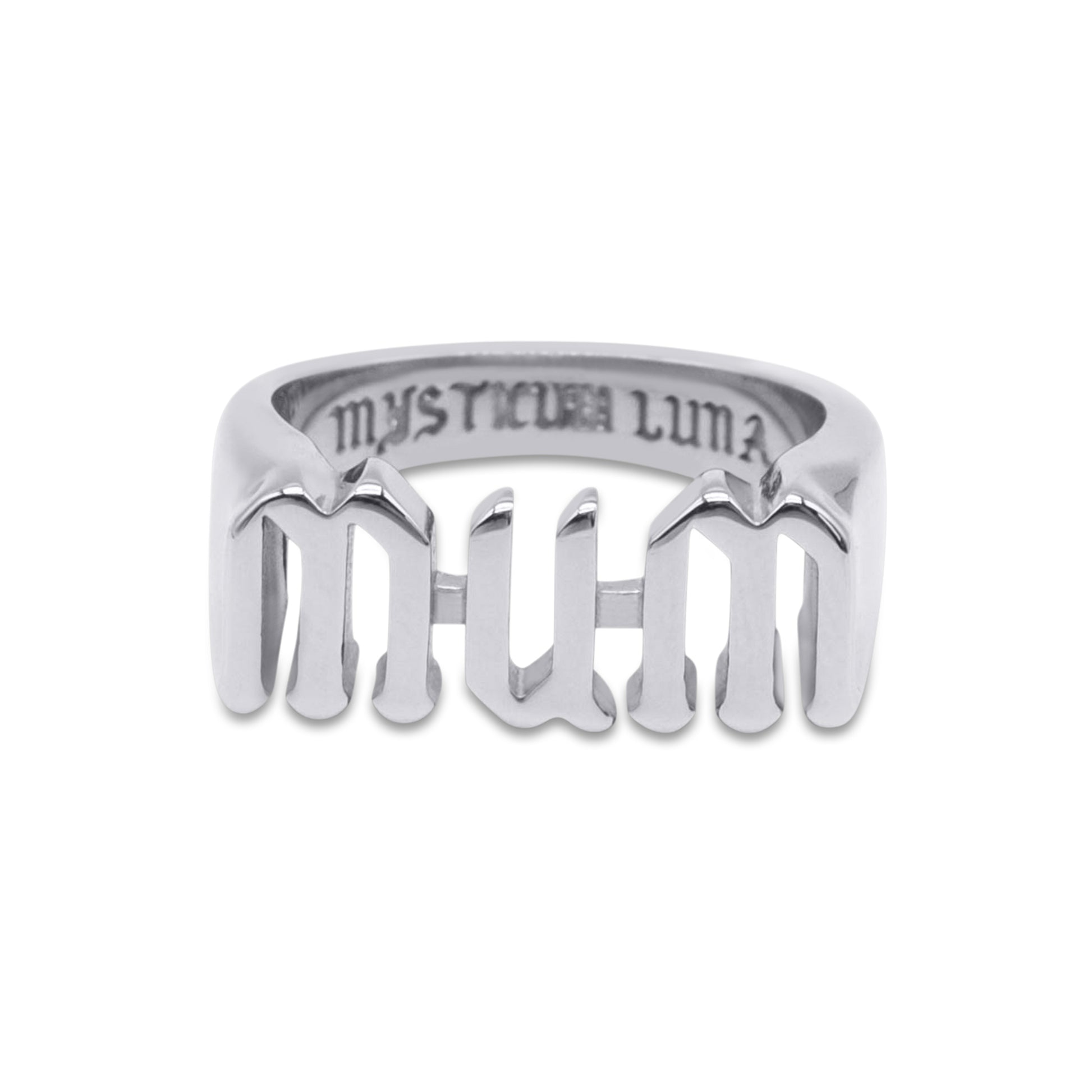 The Mum Ring is crafted in solid stainless steel, its bold gothic lettering forming a striking, sculptural silhouette across the finger.