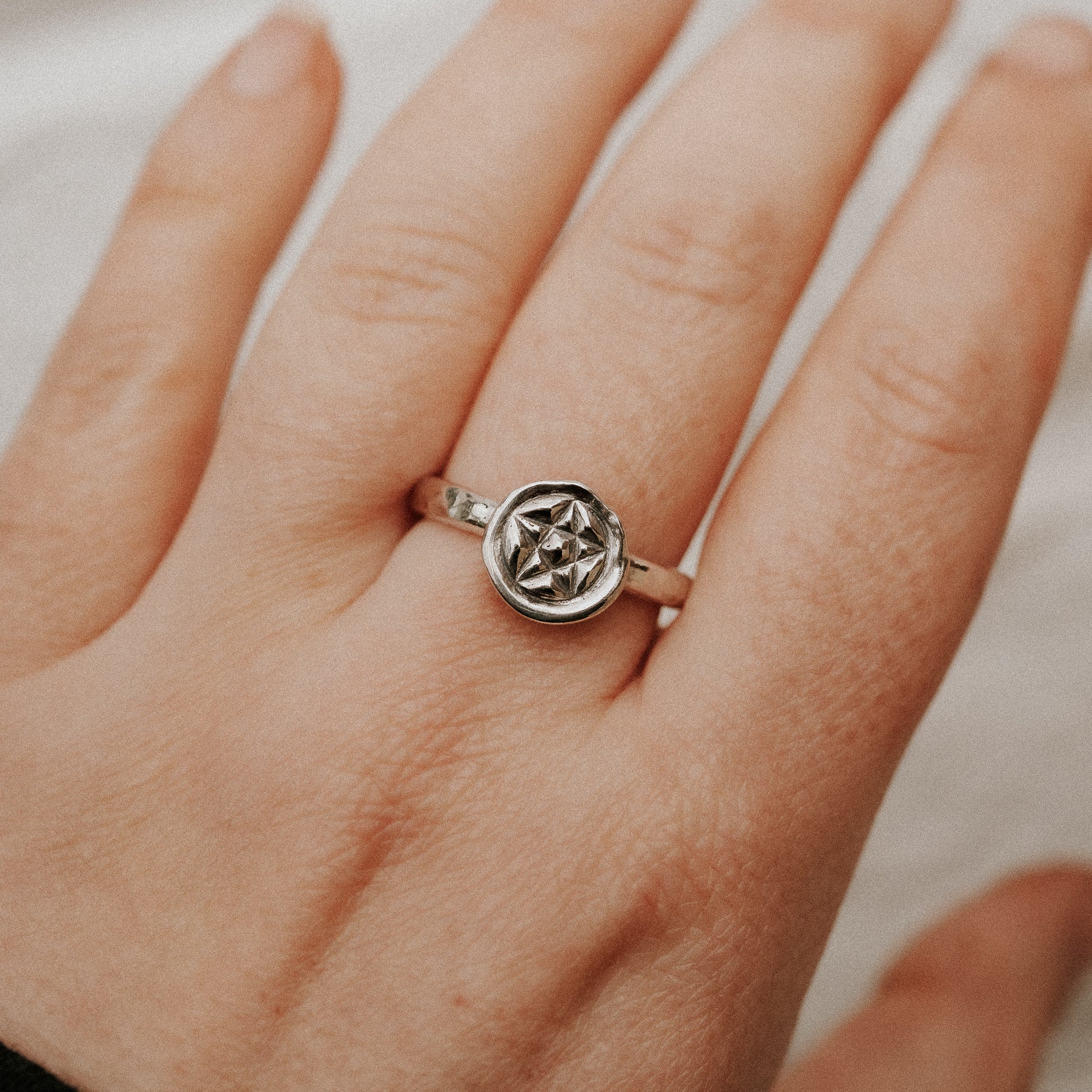 The ring features a subtle yet striking pentagram detail set on a textured hammered band, offering a unique blend of mystical charm and modern craftsmanship. Durable and comfortable, it makes a meaningful accessory for everyday wear or a standout statement piece.